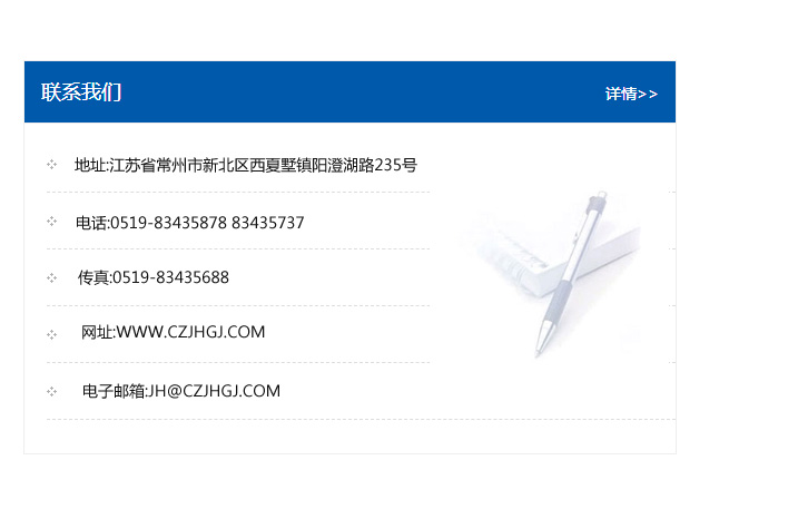 傳真:0519-83435688    郵編:213135    網址:WWW.czjhgj_com.clsyton.com    電子郵箱:JH@czjhgj_com.clsyton.com